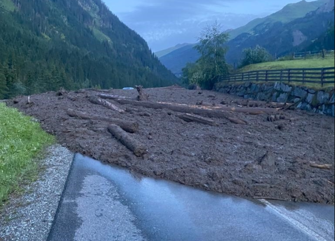 Die Straße wurde auf einer Länge von 100 Metern bis zu vier Meter hoch vermurt und musste vorerst gesperrt werden.