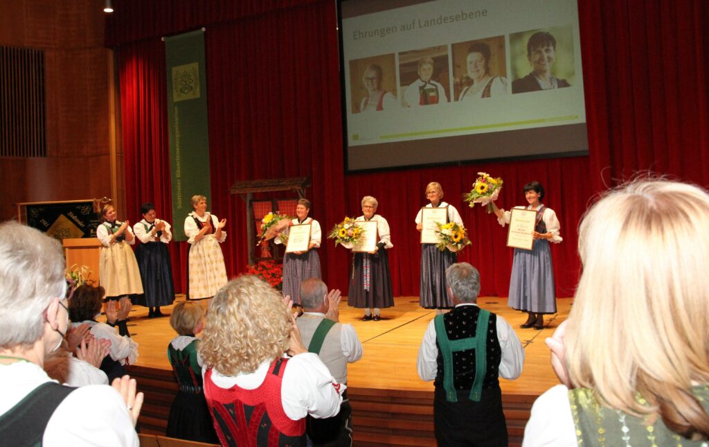 Mit dem Ehrenzeichen in Gold wurden Hiltraud Neuhauser Erschbamer, ehemalige Landesbäuerin, sowie Maria Hafner Egger, ehemalige Landesbäuerinnen-Stellvertreterin, für ihre langjährige Funktionärinnenarbeit geehrt. Anna Dorfmann Jocher, ehemalige Bezirksbäuerin Eisacktal und Rita Vantsch Verginer, ehemalige Bezirksbäuerin Pustertal, erhielten die Ehrennadel in Silber. „Wir danken euch für euren langjährigen ehrenamtlichen Einsatz für die Bäuerinnen. Ihr wart stets mit Freude, Begeisterung und Weitblick für die Bäuerinnen unterwegs – Vergelt´s Gott dafür“, so Landesbäuerin Egger.
