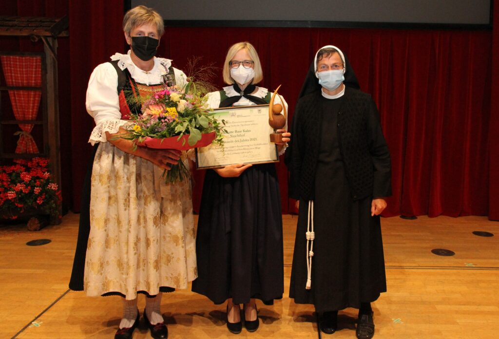 Brigitte Baur Kahn mit Landesbäuerin Antonia Egger und Sr. Mirjam Volgger bei der Übergabe der Auszeichnung zur Bäuerin des Jahres 2021 – Foto: Südtiroler Bäuerinnenorganisation