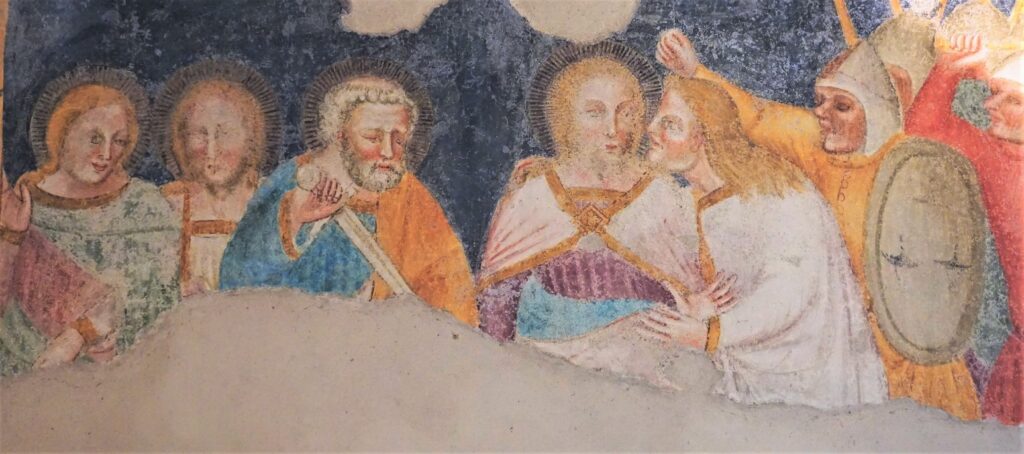 Ein zweiter Freskenzyklus im ungewöhnlich reich verzierten Kirchlein zeigt die Passion des Herrn von einem ebenso unbekannten Meister des 14. Jahrhunderts aus dem deutschsprachigen Raum. Eines der Fresken zeigt Jesu Festnahme im Garten Getsemani – eine Begebenheit aus der Gründonnerstagsliturgie. Eindeutig zu erkennen sind Petrus mit dem Schwert und Judas, der den Verrat begeht und Jesus im Angesicht der Tempelwache küsst.