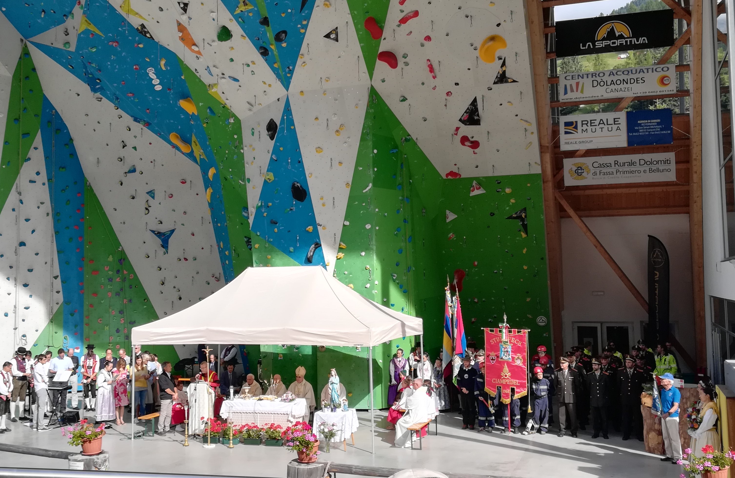 Aldidanché la festa de la Madona d’aost la rua tel maor temp de lurier e l’é stat dassen l risech che noscia jent desmentie l gran valor de chesta giornèda. Fosc per chesta rejon del 1974 Don Tito Vecchietti preve a Ciampedel, Luciano Ploner, Renzo Favé e Corrado Riz che i era menacrepes à pissà de endrezèr via, a Ciampedel, la festa di “omin da mont”. L’é stat n gran bel pensier! Da enlouta la vegn fata duc i egn. Vegn dit la messa a l’averta n onor de la Madona, vegn pojà na gherlanda de arbegola dedant al monument de la guides e recordà la storia de l’alpinism fascian. Endèna Messa vegn preà che Senta Maria Maor vèrde via con sie mantel e sia doucia veièda duc chi che va sa mont e a crepes, che sie per lurier o per spas. Vegn dit develpai al Creator per ne aer donà chesta maraveousa val che ne dèsc l met de aer lurier vejin a cèsa per tirèr su noscia families. Se recorda i valores che nesc veies ne à lascià, la fe, l tegnir dur, la legreza e soraldut l se didèr fora un co l’auter tel besegn. A jir sa mont se fèsc fadìa, i vièi i é erc ma canche se rua sun som i eies pel goder de vedudes maraveouses, l cher pel troèr pèsc e l’ènema pel se arvejinèr a chel Bel Die del Ciel. Coscita l’é ence te la vita, se fèsc fadìa a arjonjer n ensomech, vèlch outa se à besegn de zachei che ne deida a jir inant e canche zacan se rua a piz se proa na gran legreza.