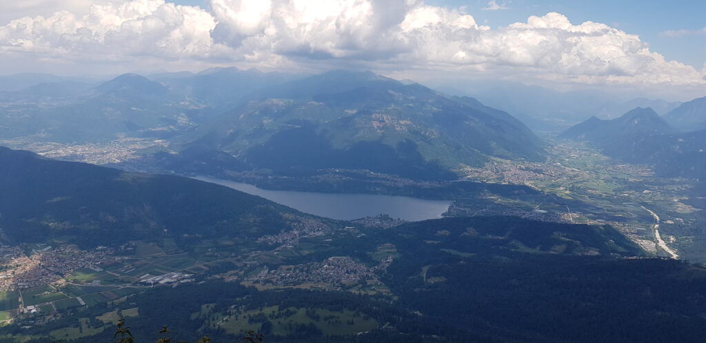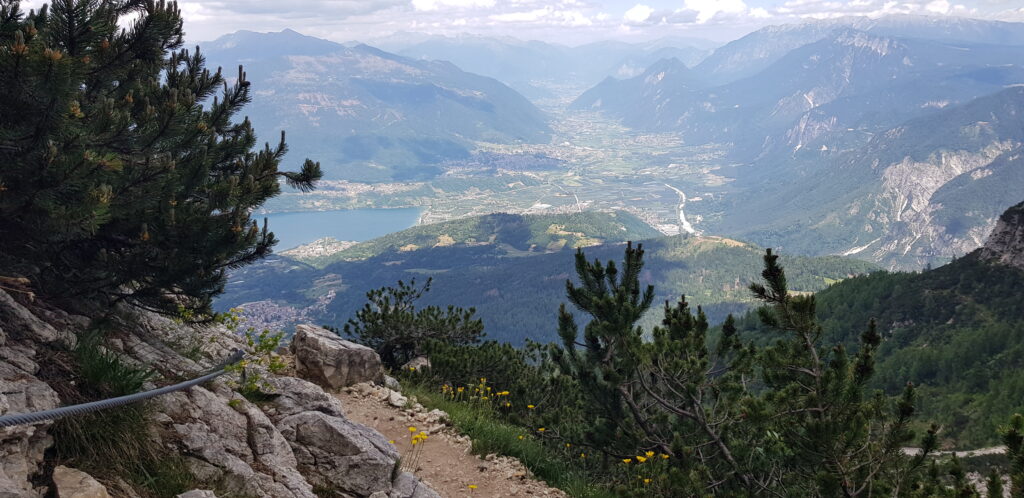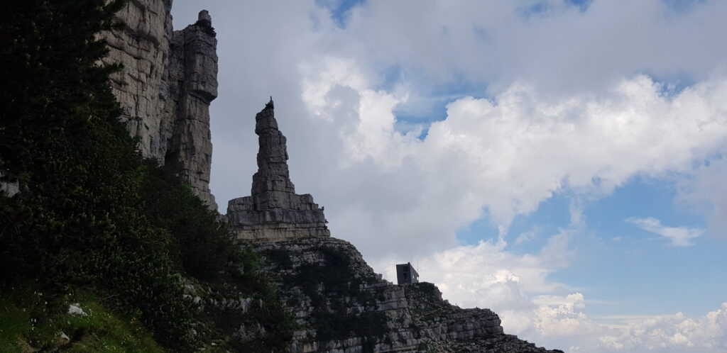 Il sentiero è impervio, per escursionisti esperti, EE 445 e 444, la direzione è quella per il Bivacco Vigolana. La salita mette da subito a dura prova l’escursionista, il percorso sale infatti ripido da Malga Doss del Bue (1028 m.) e attraversa un fitto bosco ombreggiato che concede una tregua alla calura di agosto. Il sudore imperla la fronte e inumidisce le braccia che con forza spingono sui bastoncini mentre la salita si fa più impegnativa quando alla fitta vegetazione si sostituisce una lunga serpentina rocciosa che risale il crinale della montagna per la Val Larga. Davanti all’escursionista il profilo distinguibile della guglia della Madonnina segna la sua meta verso cui ora procede sempre più attento e concentrato. Il sentiero è infatti piuttosto esposto ed è necessario piede fermo e mani ben salde sul cordino di acciaio che aiuta negli attraversamenti a strapiombo sulla roccia. L’escursionista nonostante l’occhio vigile sul sentiero non può non sollevare lo sguardo verso l’orizzonte che gli si apre davanti, una vista mozzafiato sulla Valsugana e sul magnifico lago di Caldonazzo.
