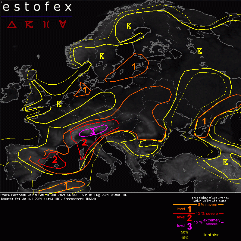 Der 20-jährige Marlinger möchte im Zusammenhang mit den bevorstehenden Gewittern noch etwas unterstreichen: „Laut Einschätzung der Spezialisten von ‚estofex‘ (‚estofex‘ ist ein Vorhersagedienst von extremen Wetterereignissen in Europa) liegen wir, neben der Lombardei, Trentino, Osttirol, Kärnten, am heutigen Samstag im Level 3“. Dies ist die höchste Warnstufe, welche der Vorhersagedienst ausruft.
