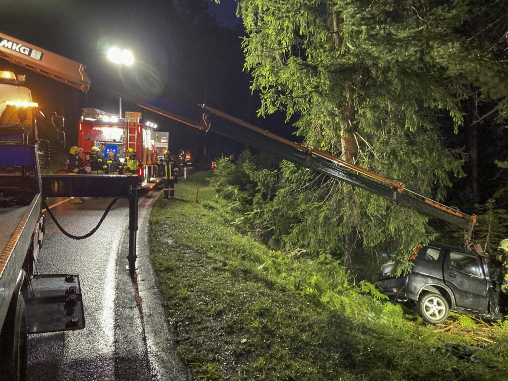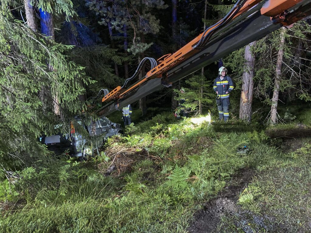 Das Unfallfahrzeug wurde mit Hilfe des Krans des Schwerrüstfahrzeugs der Feuerwehr aus dem Wald geborgen. Am Pkw entstand ein erheblicher Sachschaden.