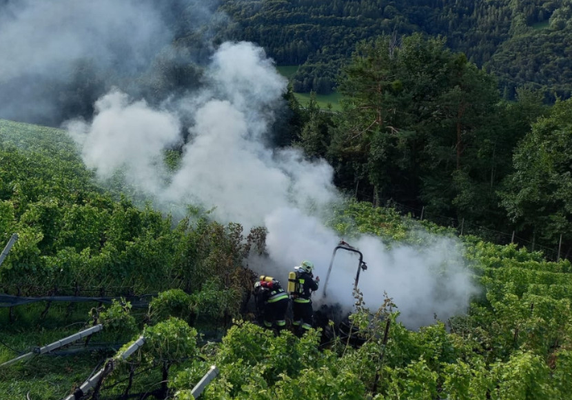 Um 8.37 Uhr wurde die Freiwillige Feuerwehr Aldein alarmiert. Ein Traktor stand in Weinreben in Flammen.