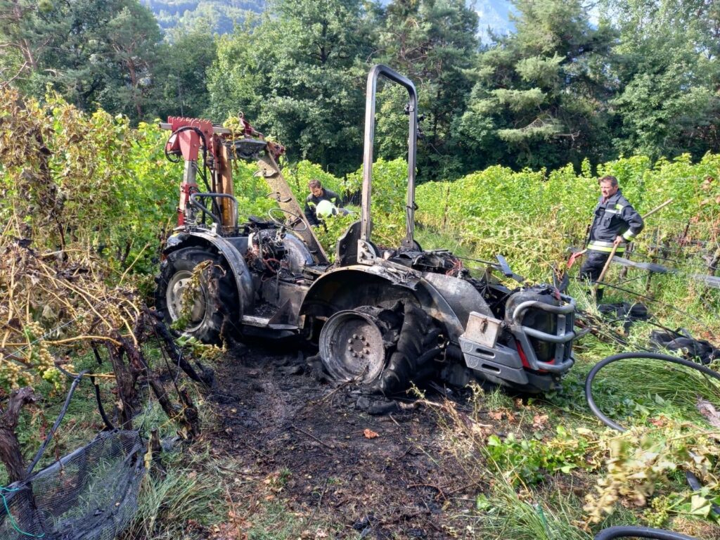 Um 8.37 Uhr wurde die Freiwillige Feuerwehr Aldein alarmiert. Ein Traktor stand in Weinreben in Flammen.