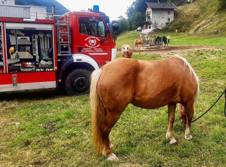 Am Einsatz beteiligen sich neben der Feuerwehr St. Leonhard in Passeier auch der Besitzer des Pferdes und ein Tierarzt.