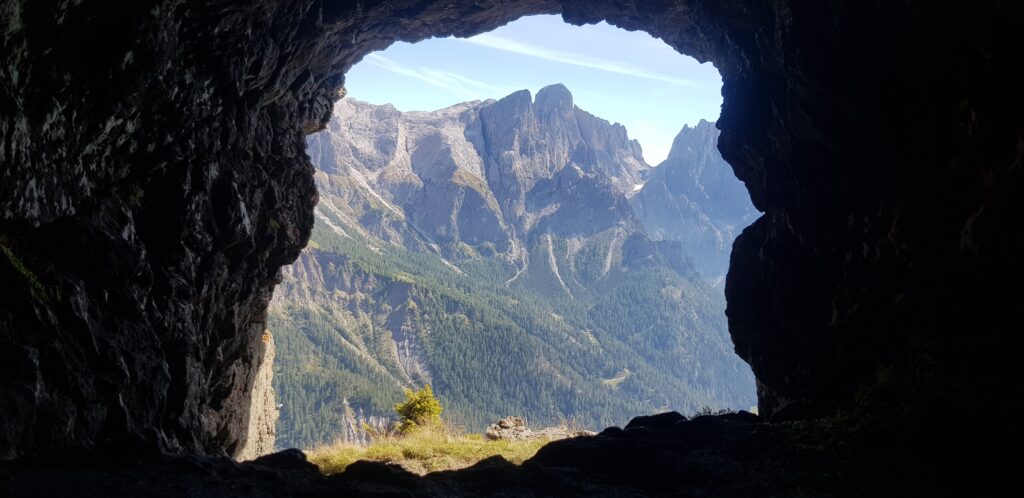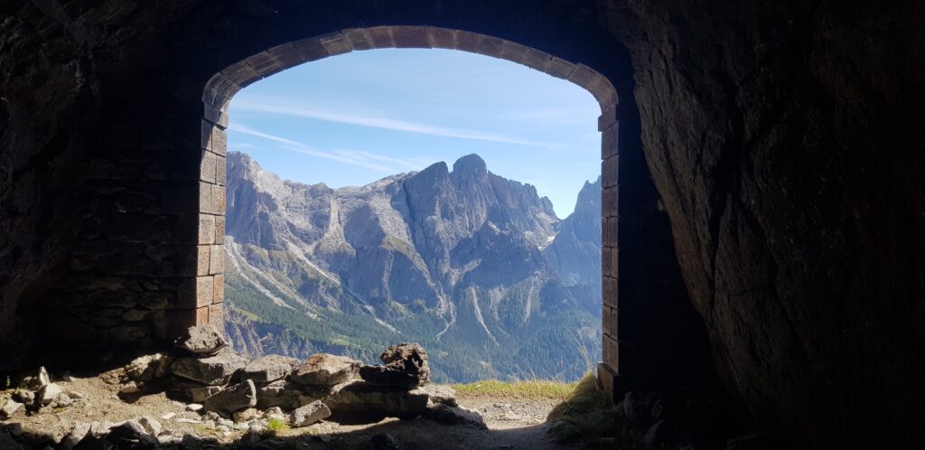 Eppure, proprio lì, in quel luogo che sembra pervaso di pace, in cui anche i contrari appaiono in simbiosi, la guerra ha lasciato il segno, rendendo quel luogo protagonista di una delle lotte più sanguinose della storia dell’uomo. Proprio salendo lungo la pista da sci di Tognola, dal Passo Rolle, i resti di trincee, camminamenti e gallerie testimoniano la storia di un luogo che fu caposaldo austro-ungarico a difesa della val Travignolo. Seguendo il segnavia per “Cavallazza Piccola – Stoli della Cavallazza” è, infatti, possibile inoltrarsi e visitare gli „stoli“ scavati dai soldati italiani nella roccia, per difendersi dall’artiglieria austriaca posizionata al Forte Dossaccio. Ancora resti di appostamenti militari si incontrano percorrendo una cengia lungo il crinale della Cavallazza Piccola, sulla quale si aprono una serie di postazioni con feritoie e finestroni.