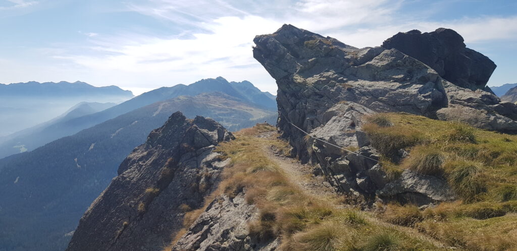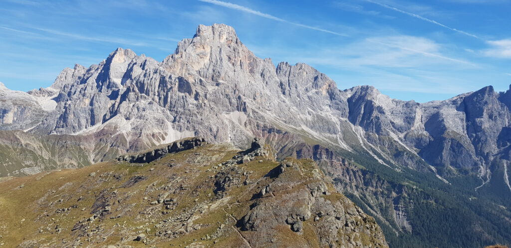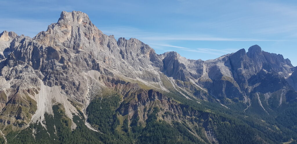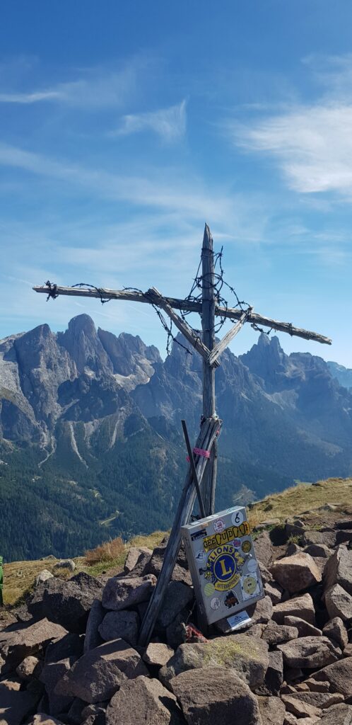 Un abbraccio tra il Lagorai, lunga e ampia catena montuosa tra la Valsugana e la Val di Fiemme, e le Pale di San Martino, il gruppo più esteso delle Dolomiti: questo è ciò che si ammira dalla cima della montagna della Cavallazza. L’esteso e immenso Lagorai, nella sua parte terminale, sembra protendersi infatti verso il Passo Rolle, laddove il selvaggio e crudo gruppo montuoso, con la sua roccia porfirica dalla tipica colorazione scura, di un rosso vivido e cupo, incontra ed entra in contatto con la dolomia, con l’elegante e raffinata snellezza e giovinezza delle Dolomiti. L’eleganza incontra il selvaggio e, dalla croce di cima Cavallazza, non si può che rimanere in silenzio a contemplare la bellezza di un tale abbraccio.