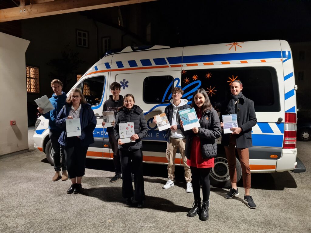 Ein Teil der Spenden wird auch dieses Jahr an den Wünschewagen gehen. Als Dank dafür kam Markus Trocker vom Weißen Kreuz mit dem Wünschewagen nach Gries und stellte den Jugendlichen das Projekt vor. Der Wünschewagen ist ein Gemeinschaftsprojekt des Landesrettungsvereins Weißes Kreuz und der Caritas Diözese Bozen-Brixen. Die Zusammenarbeit der beiden Organisationen hat sich bewährt, erklärt Markus Trocker: „Die Caritas Hospizbewegung bringt die Erfahrung mit, Betroffene und Angehörige in dieser letzten Phase des Lebens zu begleiten und das Weiße Kreuz die notwendige Professionalität bei den Krankentransporten“. In den vergangenen drei Jahren wurden 116 Wunschfahrten organisiert. Die längsten Fahrten gingen nach London, Rumänien und Palermo.