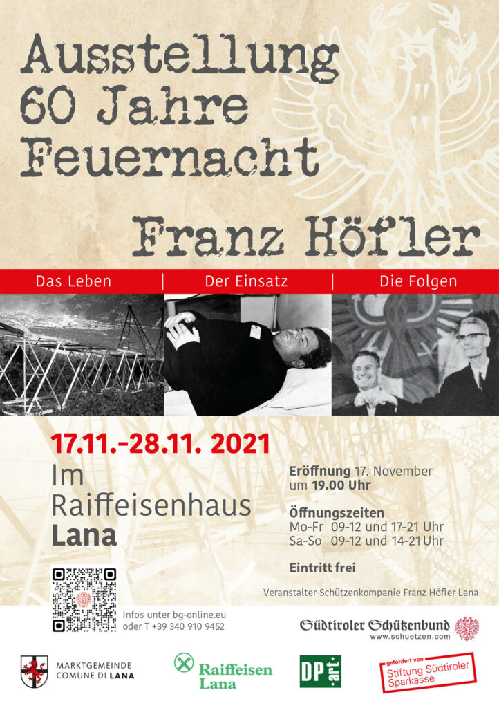Nel sessantesimo anniversario della Notte dei Fuochi e soprattutto in quello della morte di Franz Höfler – che arrestato dopo la “Notte dei Fuochi”, morì all’ospedale di Bolzano il 22 novembre 1961 per le conseguenze delle percosse subite durante gli interrogatori alla caserma dei carabinieri di Merano – la Schützenkompanie Franz Höfler di Lana organizza una mostra presso la Raiffeisenhaus di Lana.