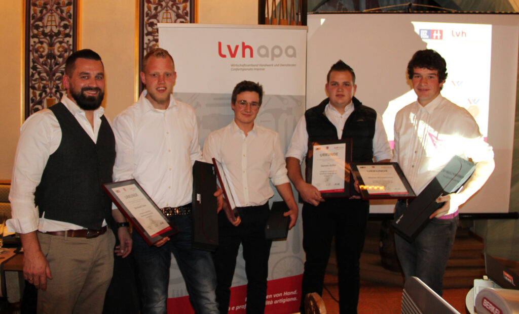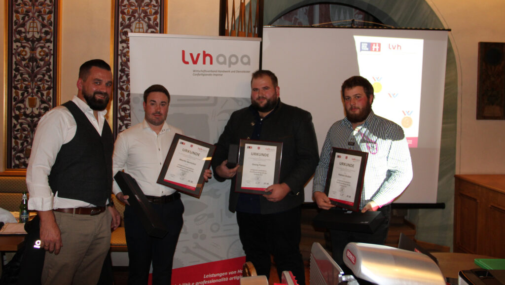 Den Abschluss der Veranstaltung bildete die Prämierung der Lehrlingsgesellen aus dem Jahr 2019 und 2020. Ausgezeichnet für die hervorragenden Ergebnisse bei der Gesellenprüfung im Jahr 2019 wurden Martin Bertolini (Ausbildungsbetrieb Bertolini Alessandro & Co Snc in Montan, Endnote 8,1), Hannes Gruber (Ausbildungsbetrieb Metzgerei Winnischhofer Herbert in Auer, Endnote 8,4) und Georg Pamer (Ausbildungsbetrieb Gruber Egon in St. Walburg, Endnote 8,9). Ebenso gut abgeschnitten haben vier junge Metzgergesellen im Jahr 2020: Bernhard Taber (Ausbildungsbetrieb Schweigl Martin in Moos in Passeier, Endnote 8,5) und Martin Nussbaumer (Ausbildungsbetrieb Zöggeler Franz & Co. KG in Burgstall, Endnote 8,5), Max Rabensteiner (Ausbildungsbetrieb Metzgerei Stefan des Rabensteiner Stefan in Kastelruth, Endnote 8,8) und Hannes Gufler (Ausbildungsbetrieb Gruber Lorenz in St. Ulrich, Endnote 9,3).