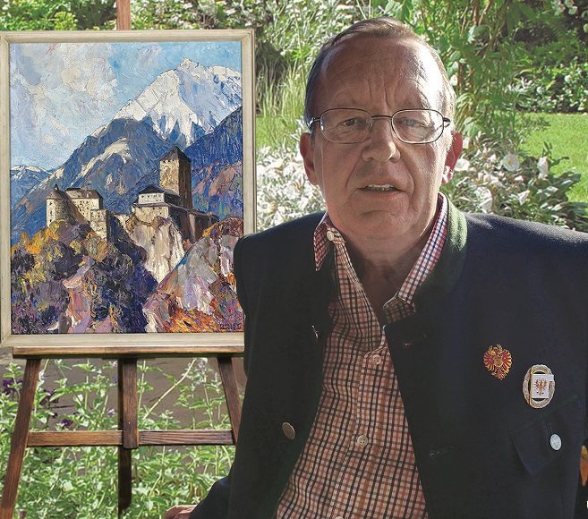 Roland Lang, Obmann des Südtiroler Heimatbundes mit Bild von Schloss Tirol des Bergmalers Oskar Mulley