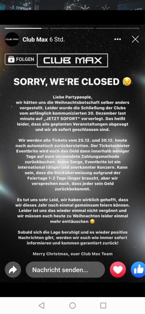 Entsprechend niedergeschlagen sind auch die Reaktionen der Betreiber und Betriebsinhaber. Das Team des „Club Max“ in Brixen informiert seine treuen Gäste und Besucher beispielsweise via Facebook-Story über die traurige Nachricht der Schließung und erklärt, dass die anfänglich kommunizierte Schließung für den 30. Dezember leider auf „JETZT SOFORT“ vorverlegt worden sei und alle geplanten Veranstaltungen abgesagt werden müssen. Bereits bezahlte Tickets vom 25. und 30. Dezember würden jedoch automatisch rückerstattet.