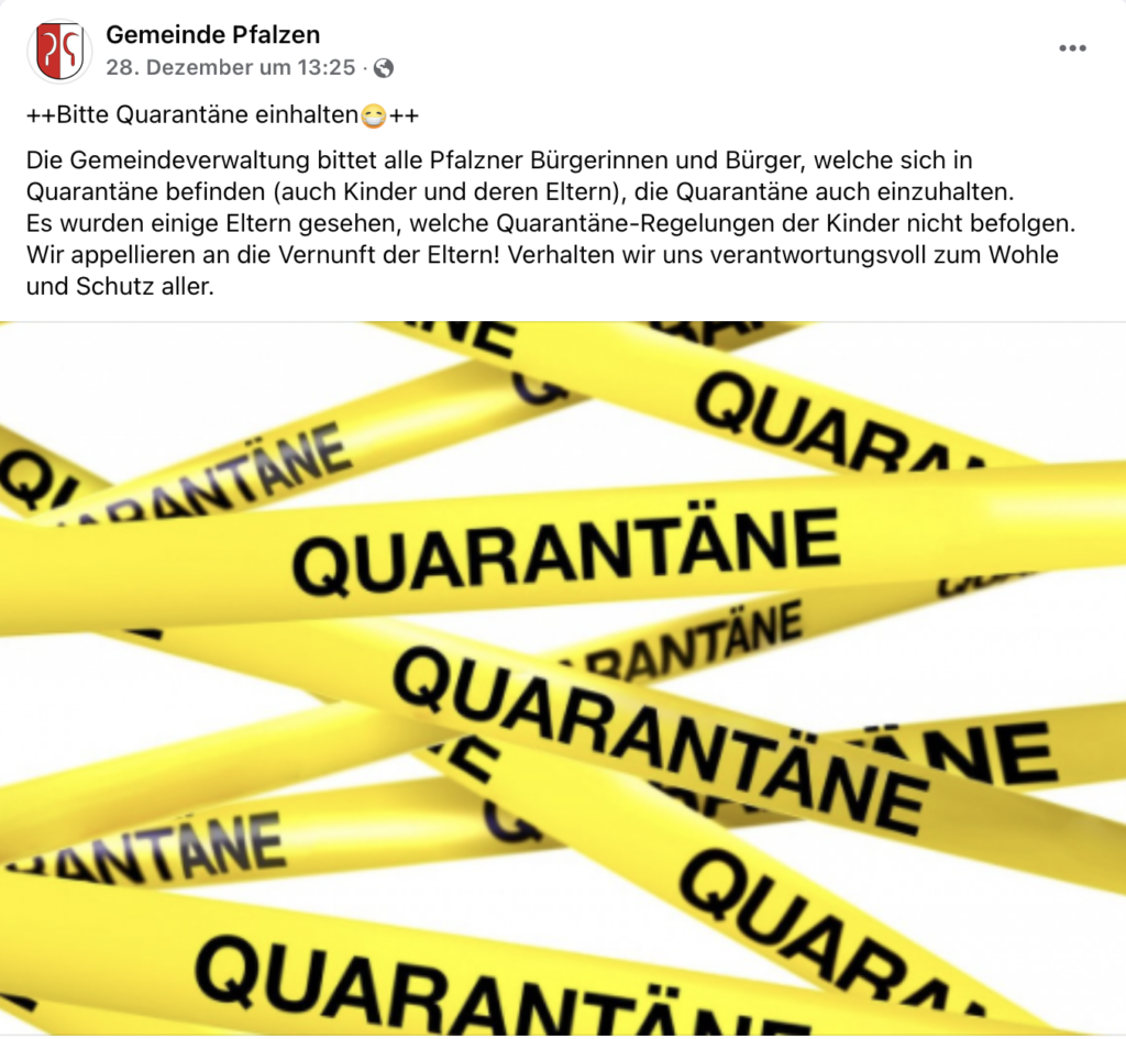 In diesem Post, der am Dienstag veröffentlicht wurde, bittet die Gemeindeverwaltung alle Pfalzner Bürgerinnen und Bürger, welche sich in Quarantäne befinden, Kinder wie auch deren Eltern, die Quarantäne-Bestimmungen einzuhalten.
