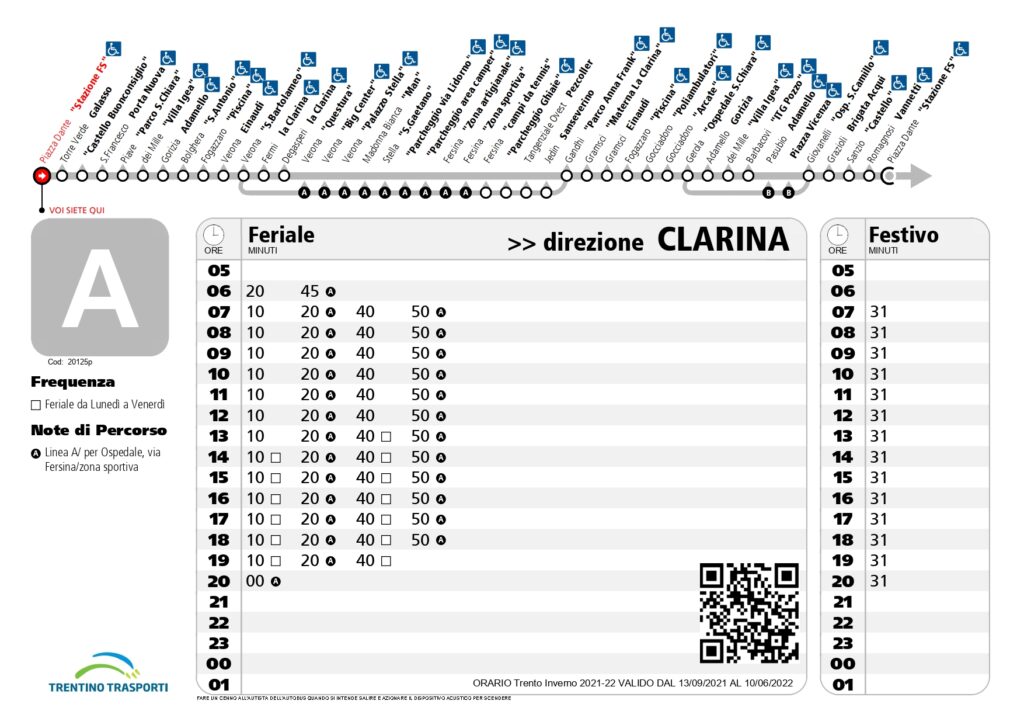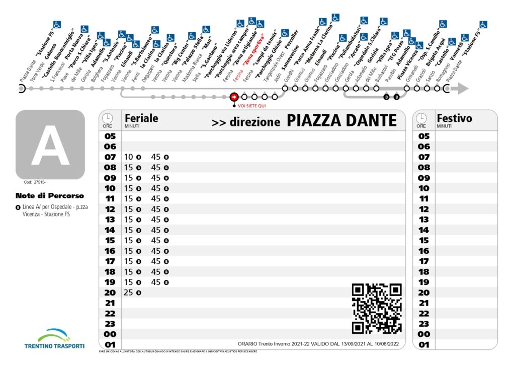 A poche decine di metri c’è la fermata (“Fersina – zona sportiva”) della Linea A che porta in centro in piazza Dante con corse ogni mezz’ora (ai 15’ ed ai 45’).