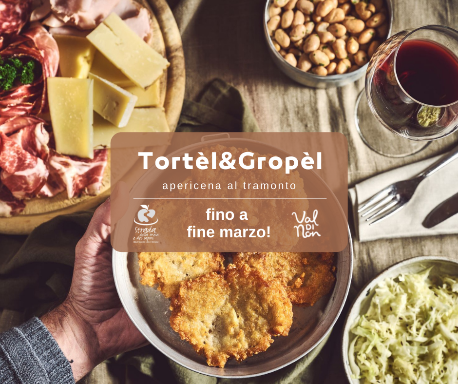 Tortèl&Gropèl è l’apericena a base delle famosissime frittelle di patate, accompagnate da speck, mortandela, pancetta e formaggi di caseificio e di malga, abbinati al vino rosso di montagna Groppello.