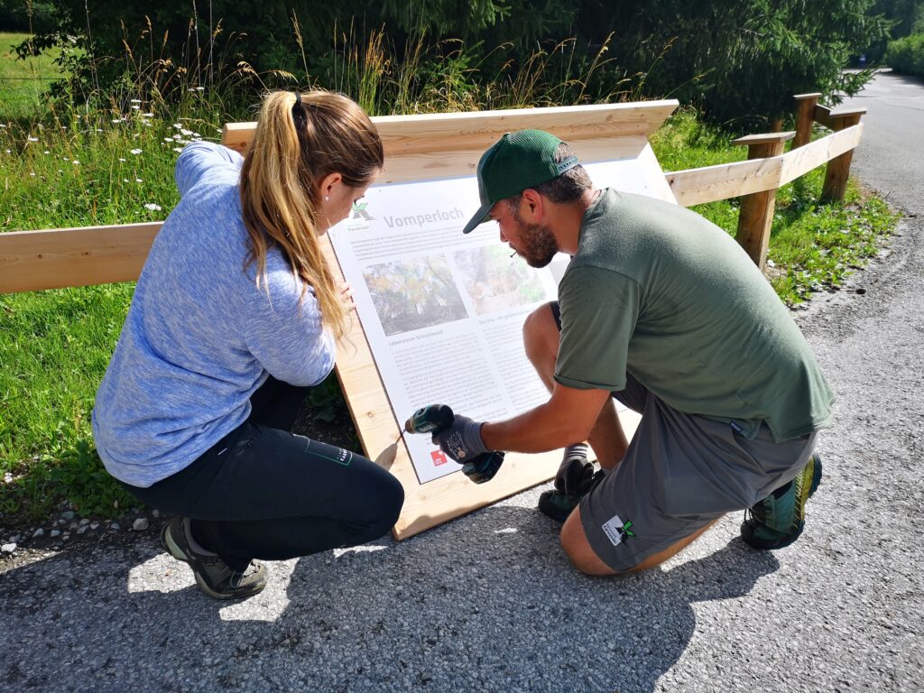 Die Naturpark-Ranger bei der Montage von Info-Tafeln zur Besucherlenkung und –information. – Bild: © Land Tirol/Hausberger