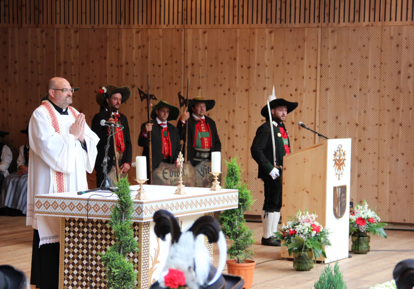 Im Anschluss übergaben die Schützen von Mayrhofen, die das große Schützentreffen im Jahr 2018 ausgerichtet hatten, die Alpenregionsfahne an die Schützen von St. Martin. Es folgte der Wortgottesdienst mit dem Landesrat der Südtiroler Schützen Pater Christoph Waldner OT. „Große Feste beginnen immer am Tag vorher“, so Pater Christoph in seinen einleitenden Worten. „Ostern beginnt am Karsamstag, Weihnachten an Heilig Abend.“ Der feierliche Auftakt und der Wortgottesdienst wurden umrahmt von den Musikkapellen St. Martin und Saltaus.