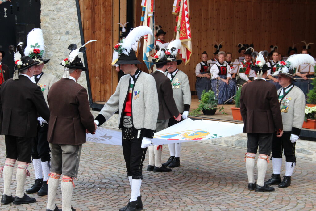Im Anschluss übergaben die Schützen von Mayrhofen, die das große Schützentreffen im Jahr 2018 ausgerichtet hatten, die Alpenregionsfahne an die Schützen von St. Martin. Es folgte der Wortgottesdienst mit dem Landesrat der Südtiroler Schützen Pater Christoph Waldner OT. „Große Feste beginnen immer am Tag vorher“, so Pater Christoph in seinen einleitenden Worten. „Ostern beginnt am Karsamstag, Weihnachten an Heilig Abend.“ Der feierliche Auftakt und der Wortgottesdienst wurden umrahmt von den Musikkapellen St. Martin und Saltaus.