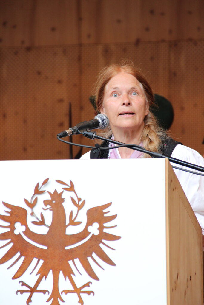Im anschließenden Heldengedenken zog die ehemalige Landtagsabgeordnete Eva Klotz einen Bogen zwischen der Vergangenheit und der Gegenwart „Wenn wir die Bilder der jüngsten kriegerischen Auseinandersetzung sehen, dann fällt auf, wie viele junge russische Soldaten dabei sind, denen nicht einmal gesagt wurde, dass sie in einen Krieg ziehen“, so Klotz. „Diese jüngste Geschichte mahnt uns wieder: Wehret den Anfängen – es sind Diktatoren, die neue Kriege entfachen.“ Eva Klotz erinnerte in ihren Worten besonders an den Tiroler Freiheitshelden Andreas Hofer, den Bürgermeister von St. Leonhard Josef Pixner (von den Faschisten verfolgt) und den Freiheitskämpfer der 60er Jahre Luis Amplatz. „Sie alle hätten noch gerne gelebt und schöne Jahre in der Heimat mit der Familie verbracht. „Unsere Verantwortung für die Freiheit fragt uns, was uns aufgegeben ist, damit wir heute nicht schuldig werden für die Zukunft.“ Es folgte die Kranzniederlegung.