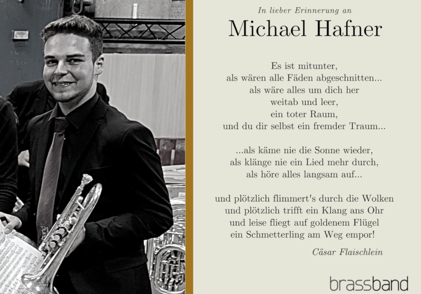„Fassungslos und erschüttert über den tragischen Tod, der den Kornettisten Michael so plötzlich aus unserer Mitte gerissen hat, sprechen die Musiker der Brassband Überetsch Familie Hafner ihr herzlichstes Beileid aus. Wir teilen mit Ihnen den unsäglichen Schmerz, den Sie durch diesen schweren Schicksalsschlag erleiden und beten gemeinsam für Michael und all seine Lieben. Der Herrgott hat einen unglaublich liebenswürdigen und hilfsbereiten Musiker zu sich gerufen. Wenn wir wieder konzertieren, hörst du zu und bist mitten unter uns! Pfiati Michael“