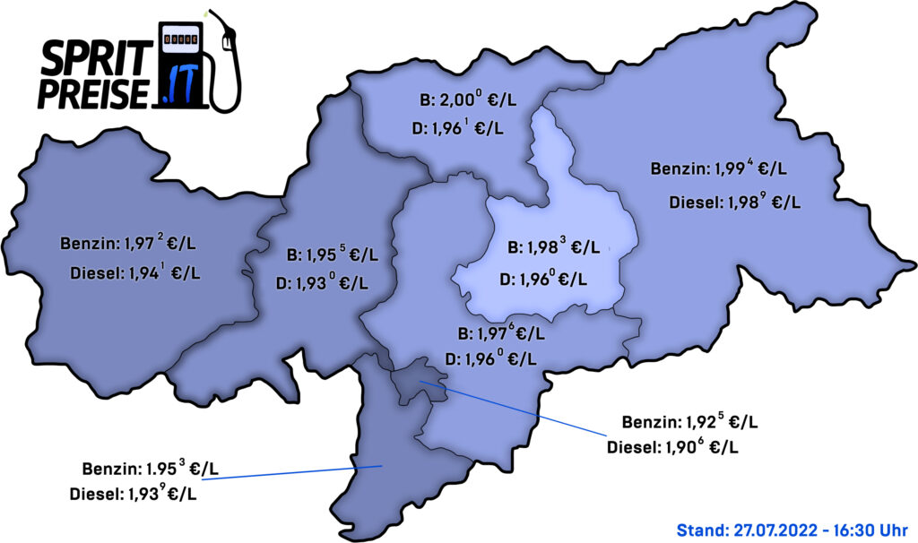 Der Diesel ist hingegen im Pustertal am teuersten mit 1,98 €/Liter. Am wenigsten muss dafür wiederum in Bozen mit 1,90 €/Liter bezahlt werden.