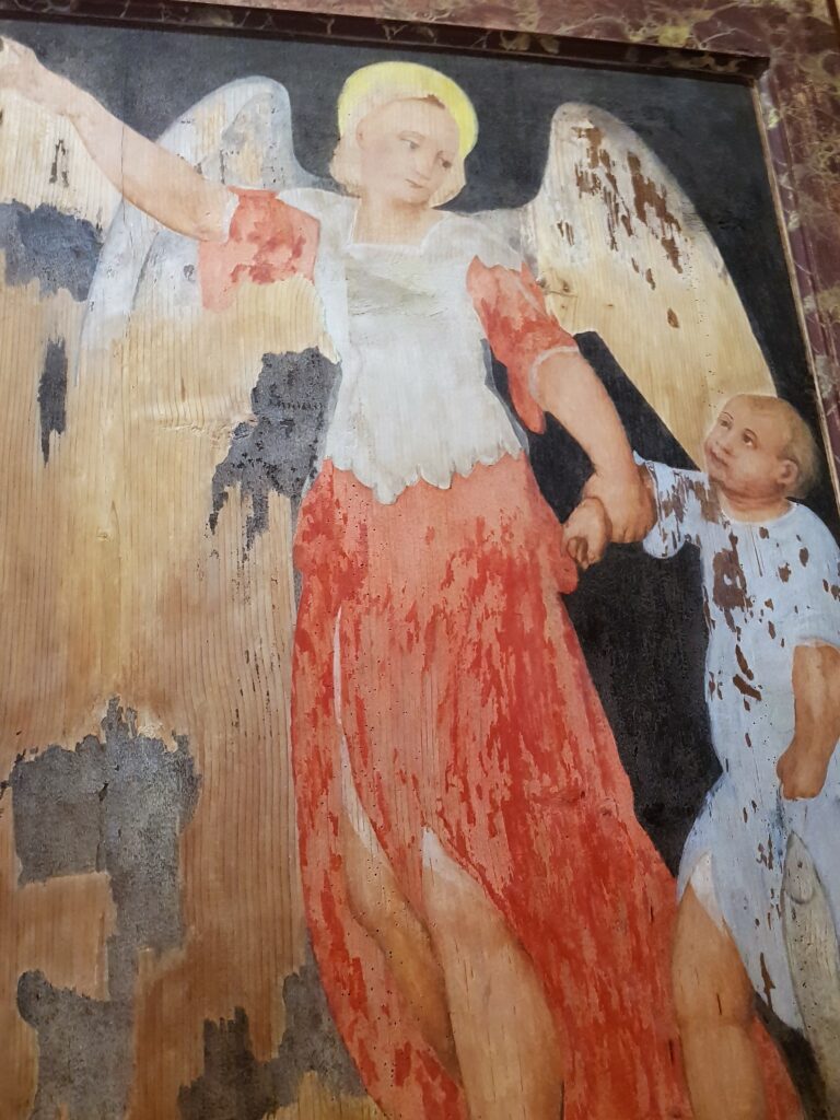 I dipinti, realizzati a tempera su tavole di legno, rappresentano all’esterno (e visibile a portelle chiuse) l’Annunciazione di Maria con gli Arcangeli Michele e Raffaele. Al’interno invece sono raffigurati San Martino che divide il mantello con il povero, Sant’Antonio, San Rocco e San Giovanni Battista.