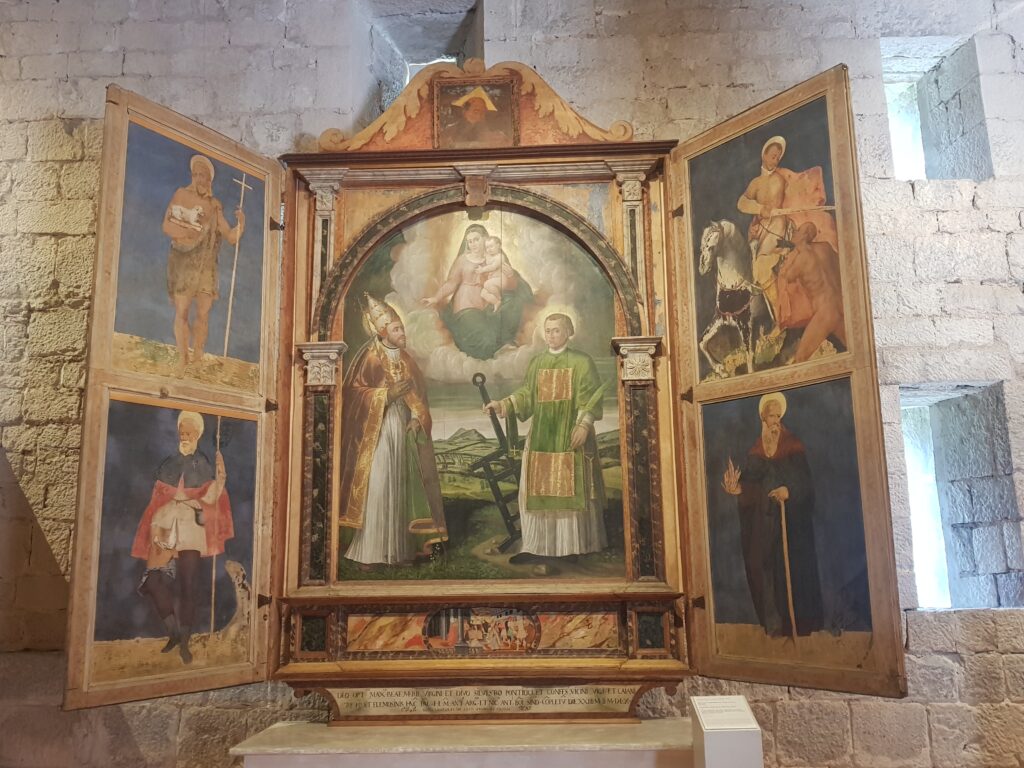 Il nostro cammino oggi ci riporta in terra giudicariese, più precisamente a Castel Stenico, dove è temporaneamente custodito per il restauro della struttura – l’altare della chiesa di San Silvestro a Vigo Lomaso.  L’opera, dipinta dai veronesi Ligozzi padre e figlio, quest’ultimo più tardi pittore alla corte medicea, risale al 1557 ed è un particolare altare a portelle, che nei giorni feriali veniva chiuse, per essere aperte nelle festività e durante le celebrazioni.