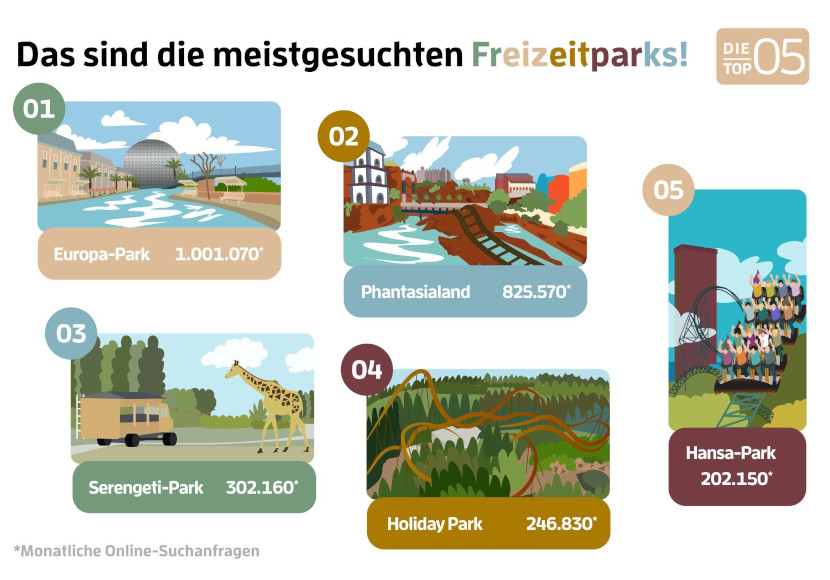 Der Park bietet auf einer Gesamtfläche von 950.000 m² über 100 Attraktionen und einige Shows in 18 Themenbereichen. Zum Park gehören zudem der Wasser-Erlebnispark Rulantica und das VR-Erlebniszentrum YULLBE. Mit 1.001.070 monatlichen Online-Suchanfragen kommt der Europa-Park ganz klar auf den ersten Platz der Auswertung der meistgesuchten Freizeitparks.