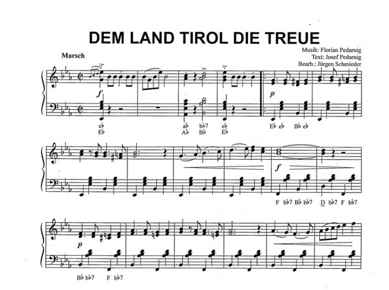 Pedarnig è l’autore della celeberrima marcia „Dem Land Tirol die Treue“, il brano musicale divenuto un inno non ufficiale, quello della terra tirolese spaccata in due dalla violenza non della storia ma dei giochi di equilibrio fra i grandi poteri mondiali.