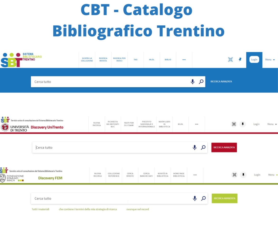 Il Catalogo Bibliografico Trentino (CBT) ha cambiato la grafica della home page. Lo comunica l’Ufficio Sistema Bibliotecario Trentino (SBT) – Servizio Attività e produzione culturale. L’obiettivo di questo intervento è rendere più chiaro, anche attraverso una grafica comune, che da qualsiasi portale si acceda al CBT – Catalogo Bibliografico Trentino – è possibile ricercare le risorse fisicamente possedute da tutte le 184 biblioteche del Sistema Bibliotecario Trentino, e accedere ad altri servizi bibliografici come banche dati, risorse elettroniche e articoli di riviste scientifiche.