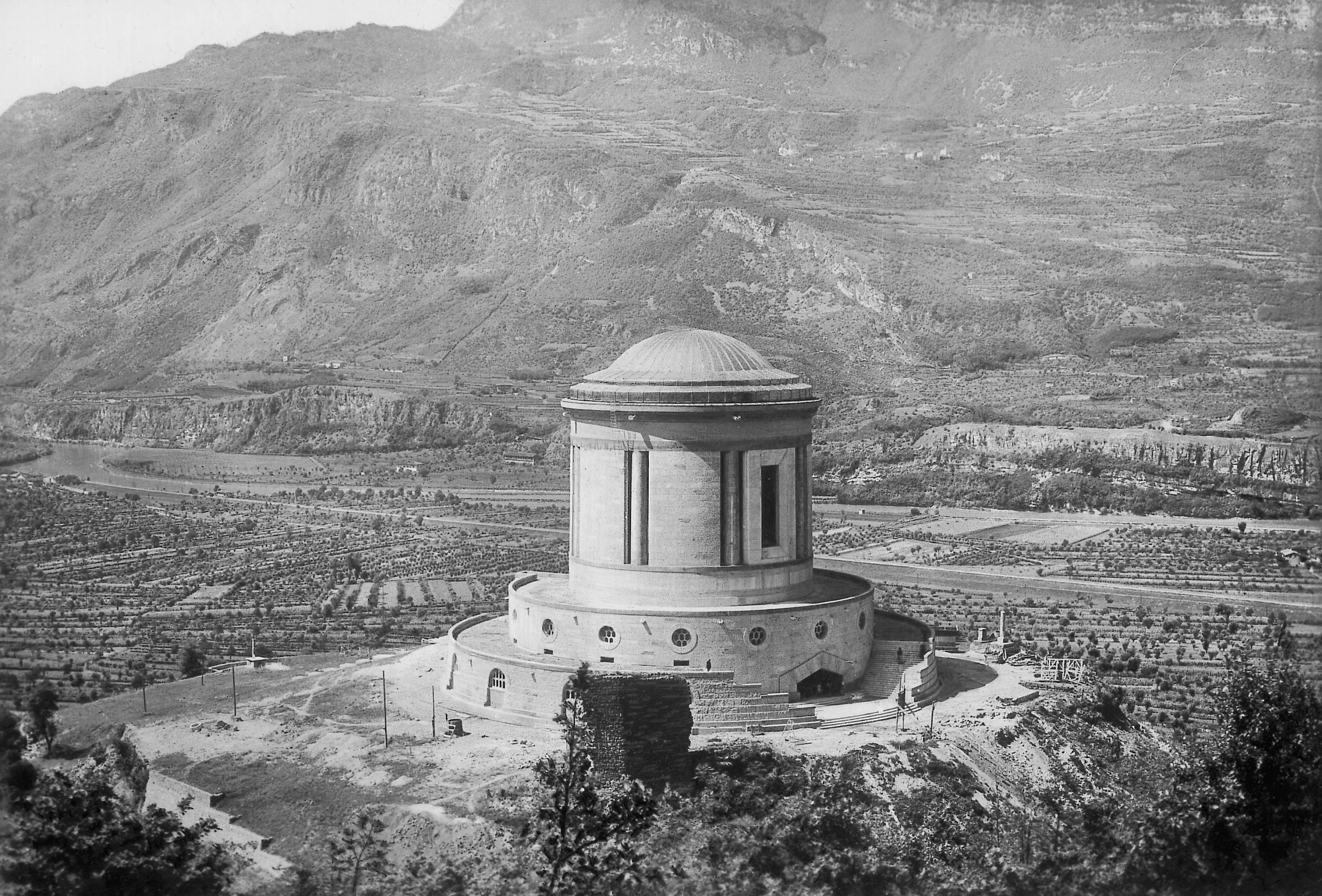 L’opera monumentale è stata costruita su progetto dell’architetto prof. Fernando Braccianti, della R, Accademia di Belle Arti di Bologna ed è costata quasi due milioni di lire. Essa raccoglie 6200 salme identificate e oltre tremila salme ignote che prima erano sparse in 150 cimiteri di montagna. Ne.lla cappella campeggiano l’ara romana e due grandi urne nelle quali saranno deposte le salme gloriose dei martiri Fabio Filzi e Damiano Chiesa.