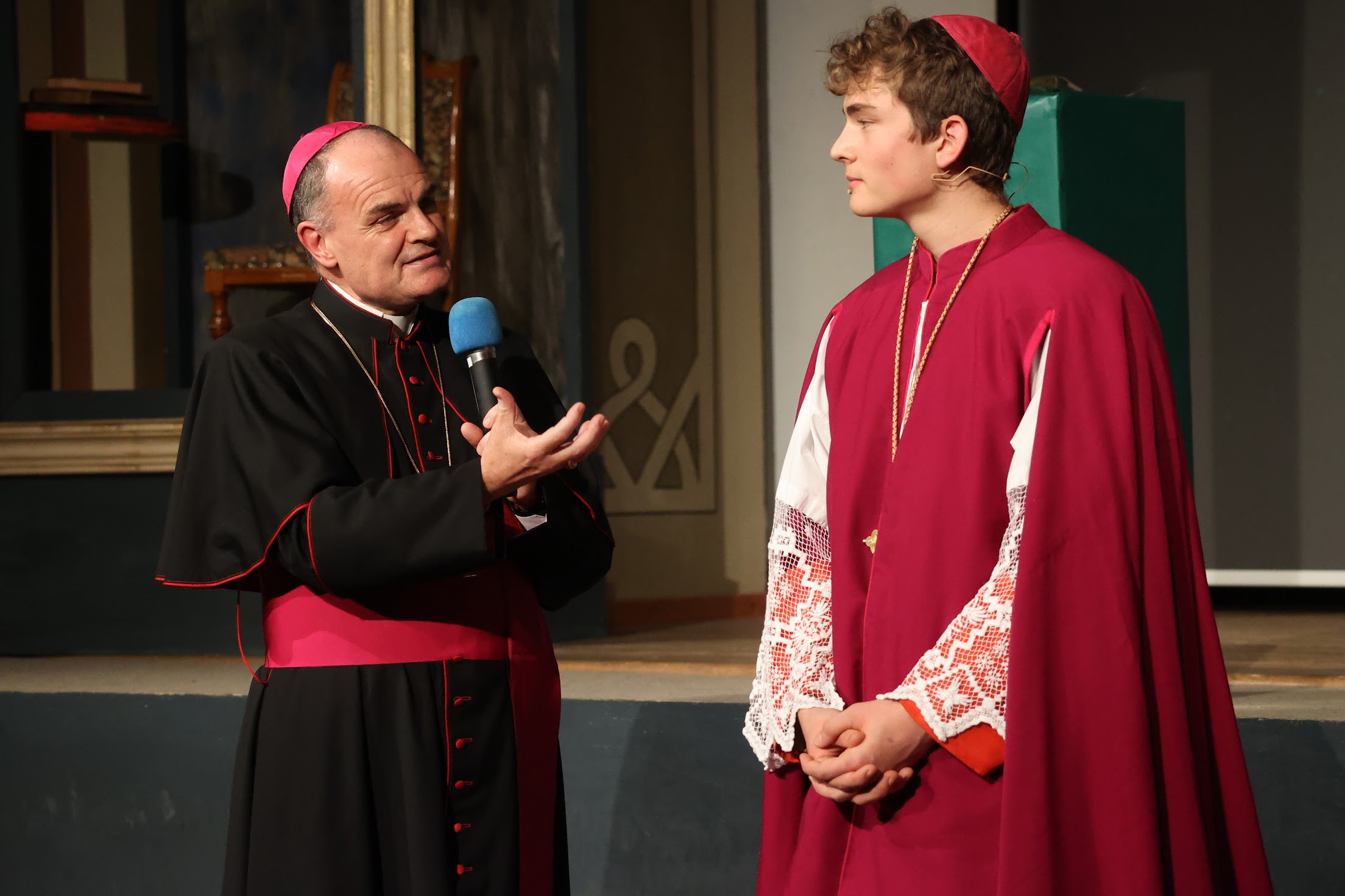 „Das Vinzentinum hat die Stürme der Zeiten nahezu schadlos überdauert und steht in vollem Glanz. Da darf man doch gratulieren, Eure Exzellenz, und dazu sind wir heute da,“ mit diesen Worten erklären die Moderatoren Lena Augschöll und Michael Axmann einem verdutzten Fürstbischof Vinzenz Gasser (gespielt von Manuel Mayr) die Situation, nachdem dieser gerade seinem Bildnis entstiegen und in die Szenerie des Festaktes geplatzt war.
