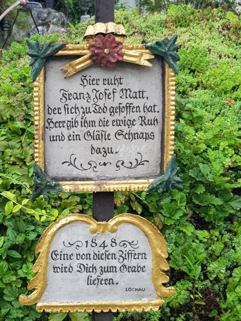 Un’altra serie, invece, presenta epigrafi scherzose, talvolta in bilico fra l’irninico ed il macabro.  Anche se sembrerebbe essere uno scherzo, quella delle „tombe divertenti“ è un’usanza antica: nata in Inghilterra fin dal 17° secolo, si è diffusa in tutta Europa. Un cimitero-museo simile a questo si può trovare per esempio in Romania, a Sapanta.