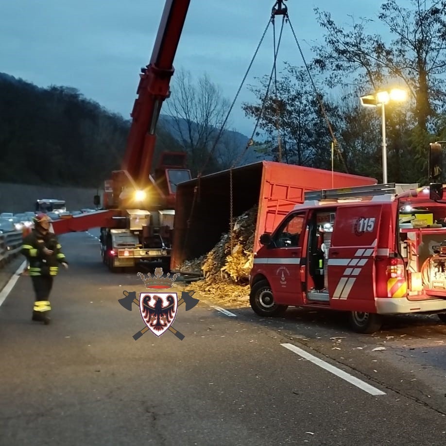 Il semirimorchio ed il materiale hanno completamente invaso la carreggiata: per rimuovere il mezzo e per ripristinare la viabilità sono intervenuti i Vigili del Fuoco Volontari di Civezzano, con il Servizio Strade della Provincia e le forze dell’ordine, necessario l’utilizzo dell’autogru.