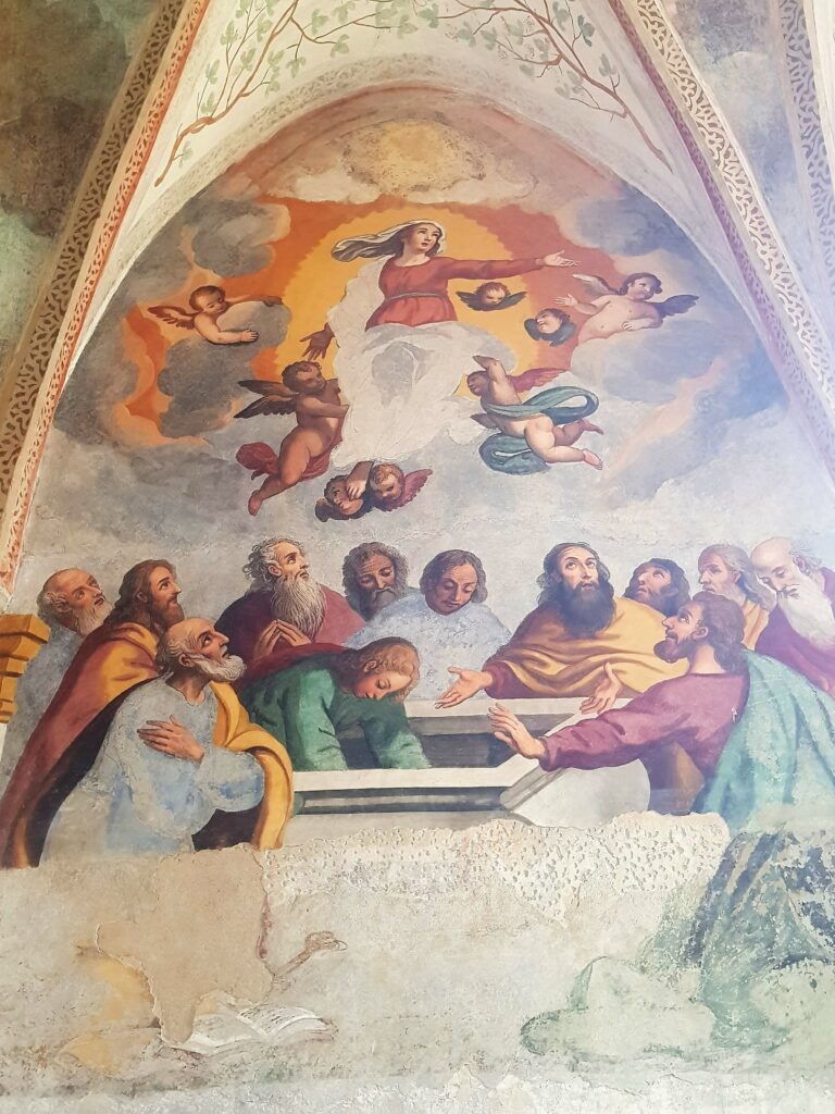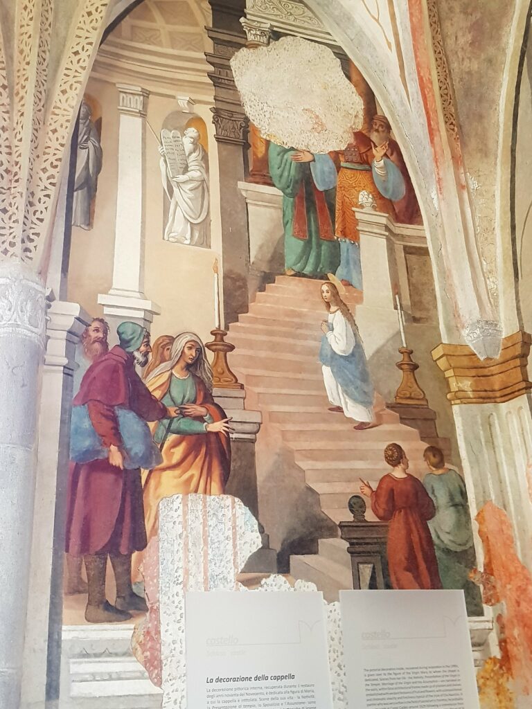 Qualche parte d’affresco si è persa, negli anni e nelle vicende vissute dal castello e dalle sue pertinenze. Ma alzando lo sguardo e lasciandolo andare verso l’alto, seguendo lo slancio degli archi acuti, si scoprono le pitture antiche di secoli. E se si ascolta con attenzione, con il cuore, si sentono voci altrettanto antiche che recitano preghiere con toni sommessi. La fede ha permeato muri, volte e vetrate…