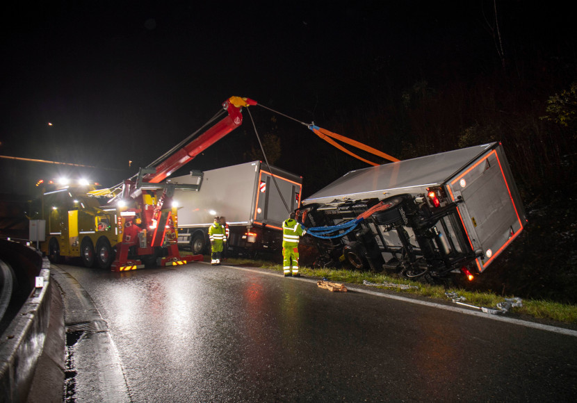 Gegen 03.00 Uhr fuhr ein LKW auf der A12 in Fahrtrichtung Kufstein. Bei der Abfahrt Innsbruck Ost kam er von der Straße ab, dabei kippte der Anhänger um.