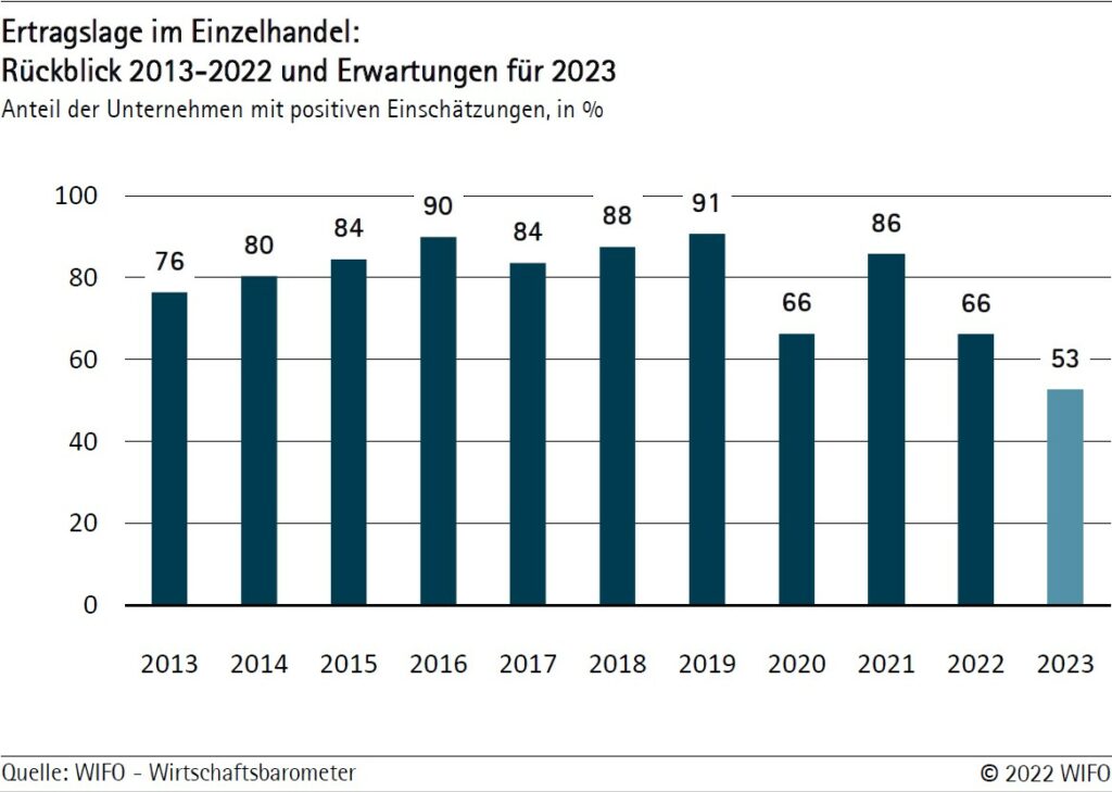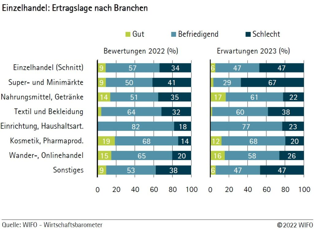 Im Einzelhandel ist das Geschäftsklima sehr verhalten. Ein Drittel der Einzelhandelsbetriebe meldet heuer eine schlechte Ertragslage und fast die Hälfte rechnet bereits mit einem unbefriedigenden Betriebsergebnis im Jahr 2023, teilt die Handelskammer Bozen mit. Dies sei vor allem auf den starken Anstieg der Kosten für Energie und für den Wareneinkauf zurückzuführen. Hinzu komme die Befürchtung eines Nachfragerückgangs in den kommenden Monaten und einer neuen Verschärfung der Konkurrenz. Daher plane jedes dritte Einzelhandelsunternehmen, die Investitionen zu verringern und einige würden auch mit einem Rückgang der Beschäftigung rechnen. Werden die einzelnen Branchen betrachtet, so ist die Stimmung vor allem bei den Super- und Mini-Märkten schlecht. Zwei Drittel davon erwarten für das kommende Jahr eine unbefriedigende Rentabilität.