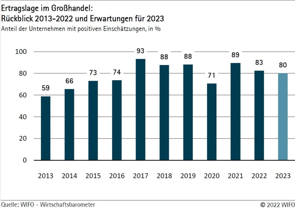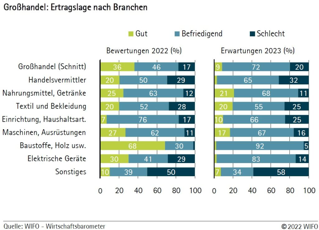Im Großhandel sieht die Situation laut Angaben der Handelskammer Bozen besser aus: 83 Prozent der Unternehmen bewerten die Ertragslage im laufenden Jahr zumindest als zufriedenstellend, ein Drittel sogar als gut. Das Umsatzwachstum werde sich 2023 fortsetzen, wenn auch in geringerem Maße, was unter anderem auf neue Preiserhöhungen zurückzuführen sei. Dies werde Investitionen, Beschäftigung und – zumindest teilweise – Rentabilität sichern. Die Ertragslage werde im kommenden Jahr in acht von zehn Fällen zufriedenstellend ausfallen, allerdings kaum jemals gut. Die Erwartungen unterscheiden sich erheblich zwischen den einzelnen Branchen. Mehr Optimismus sei bei den Großhändlern von Lebensmitteln und Getränken sowie von Maschinen und Anlagen zu beobachten. Das bescheidenste Geschäftsklima sei dagegen bei den Handelsvermittlern und im Bereich Einrichtung und Haushaltswaren zu finden.