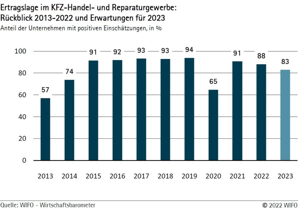 Auch der Sektor „Kfz-Handel und -Reparatur“ musste ein kompliziertes Jahr durchstehen, das durch Lieferverzögerungen seitens der Hersteller und Probleme in den Lieferketten gekennzeichnet war, die den Umsatz beeinträchtigten. Zusammen mit den steigenden Kosten und der hohen Ungewissheit führte dies auch zu einem Rückgang der Investitionen. Dennoch wird die Ertragslage im Jahr 2022 von 88 Prozent der Unternehmen als positiv eingeschätzt. Die Aussichten für das nächste Jahr seien dagegen von großer Vorsicht geprägt. Etwa ein Drittel der Befragten konnte keine Prognose zur Rentabilität abgeben. Die Sorgen der Unternehmer beziehen sich vor allem auf den weiteren Kostenanstieg und die Verschlechterung der Zahlungsmoral der Kunden. Sie erwarten auch eine Erschwerung des Kreditzugangs. Die Umsätze werden voraussichtlich leicht sinken und in vier von zehn Fällen wird eine Abnahme der Investitionen erwartet, um die Rentabilität zu sichern.