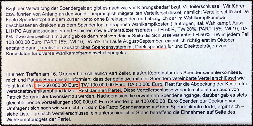 Zudem werde aus der SVP-Korrespondenz ersichtlich, dass mit den Spendern ausdrücklich vereinbart worden sei, dass die Spenden nach einem Schlüssel verteilt werden. Landeshauptmann Kompatscher erhielt demnach für seinen Wahlkampf eine Viertelmillion (250.000) Euro. Zur Erinnerung: die gesetzlich erlaubte Obergrenze liegt bei 30.000 Euro.