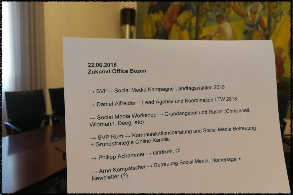 Es bestehe sohin der Verdacht, dass ein Teil der Abrechnung einfach „kreativ“ durch die Teilzeitanstellung in der SVP-Fraktion mit Steuergeldern bezahlt worden sei. Dass die Ressourcen des Landtages und somit Steuergelder für den Wahlkampf von Kompatscher und der SVP missbraucht wurden, konnte laut Angaben der STF nämlich schon 2018 nachgewiesen werden, denn im Drucker des Landtages wurde das Wahlkampfstrategiepapier der Agentur vergessen.