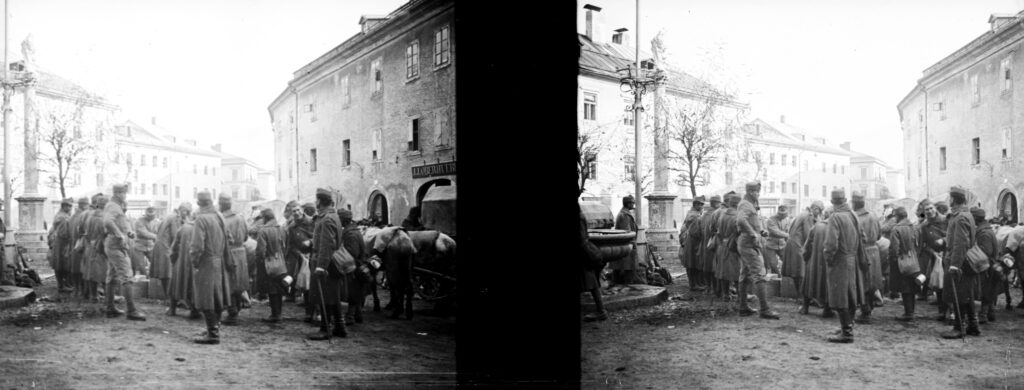 Österreichisch-ungarische Verbände „gestrandet“ zu Kriegsende am Lienzer Johannesplatz, vor der Weiterfahrt Richtung Osten, Stereofotografie, Anfang November 1918 – Foto: © Wilhelm Dronowicz; Sammlung Martin Dobernik, L33762 – TAP