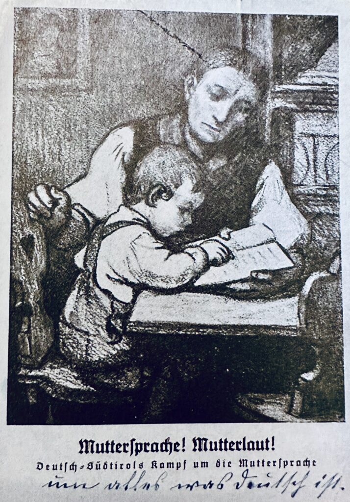 Um die Bedeutung der Muttersprache zu betonen, gab die Innsbrucker Niederlassung des österreichischen „Andreas-Hofer-Bundes“ zur Finanzierung des gemeinen „Katakombenunterrichtes“ in Südtirol eine Postkarte heraus, auf welcher die erste Zeile des Gedichtes „Muttersprache“ des deutschen Dichters Max von Schenkendorf zu lesen war: „Muttersprache! Mutterlaut!“ Im Untertitel hieß es auf der Postkarte: „Deutsch-Südtirols Kampf um die Muttersprache.“ Auf einer im Diözesanarchiv Trient aufbewahrten Karte steht von unbekannter Hand – wahrscheinlich von der Hand eines deutschen Priesters – in deutscher Kurrentschrift hinzugefügt: „um alles was deutsch ist“. […]