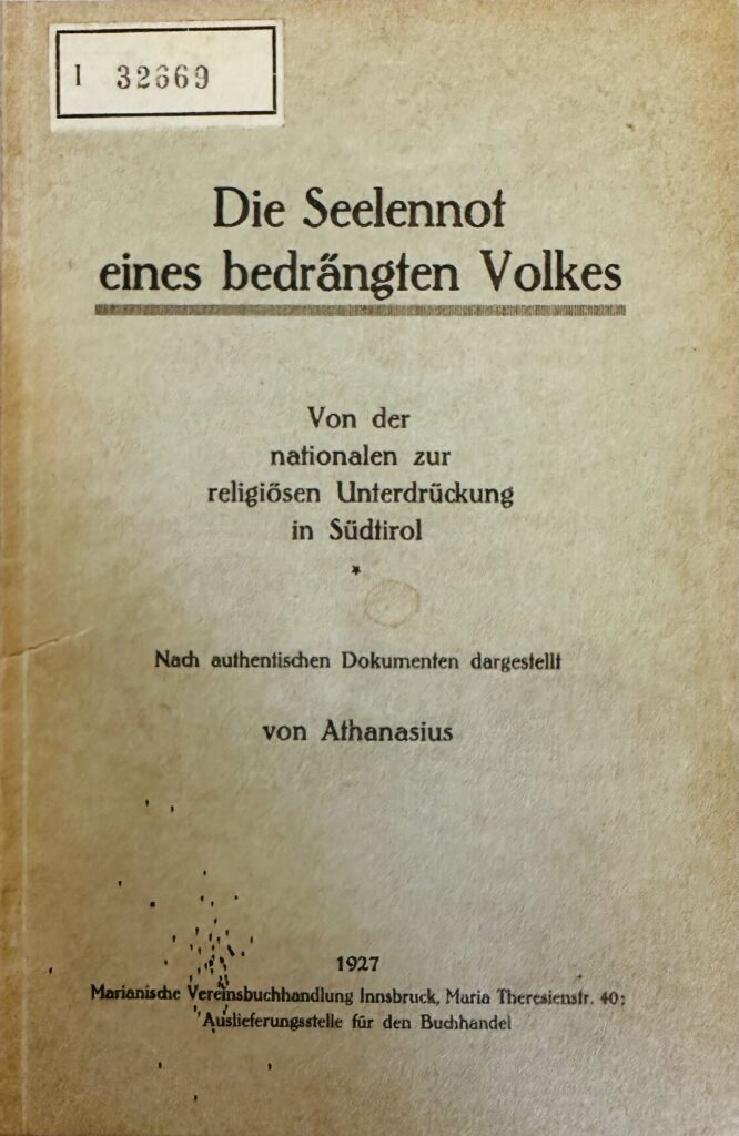 Im Jahre 1927 erschien in dem katholischen Verlag der Marianischen Vereinsbuchhandlung in Innsbruck ein Buch mit dem Titel „Die Seelennot eines bedrängten Volkes – Von der nationalen zur religiösen Unterdrückung in Südtirol“. Der Verfasser hieß „Athanasius“. Hinter diesem Decknamen verbarg sich – wie wir heute wissen – der damals nach wie von in Südtirol lebende Kanonikus des Kollegiatskapitels der Probstei von Bozen, Michael Gamper. Er hatte in dieser Schrift den aufopfernden Kampf der Südtiroler Geistlichkeit gegen die faschistischen Bemühungen dargestellt, an der deutschen und der ladinischen Volksgruppe einen Ethnozid, einen kulturellen Volksmord, zu vollziehen. Michael Gamper hatte für die in Österreich erscheinende Schrift den Decknamen „Athanasius“ benützen müssen, um nicht selbst in Südtirol der Verfolgung bis hin zur Zwangsverschickung anheim zu fallen. Dies hätte ihm verunmöglicht, weiterhin den „Katakombenunterricht“ zu organisieren, in welchem an geheimen Orten den Kindern die deutsche Sprache in Wort und Schrift vermittelt wird. […]