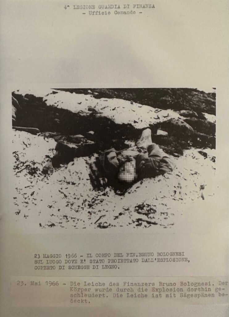 „Die offizielle Version des Herganges lautete folgendermaßen: Der Finanzer Bruno Bolognesi löste beim Betreten des Finanzerstützpunktes am Pfitscherjoch einen an der Eingangstür befestigten Zündmechanismus aus, der 50kg Sprengstoff zur Detonation brachte. Bei der Detonation wurde der Stützpunkt zerstört und Bolognesi getötet. Südtirolaktivisten aus dem Ahrntal wurden und werden bis heute beschuldigt, diesen Anschlag verübt zu haben. Vor der Hütte an jener Stelle, an der Bruno Bolognesi sein Leben ausgehaucht hat, steht heute ein Denkmal. (Über den Hergang des Vorfalles gibt es bereits einen Buchauszug auf UT24).