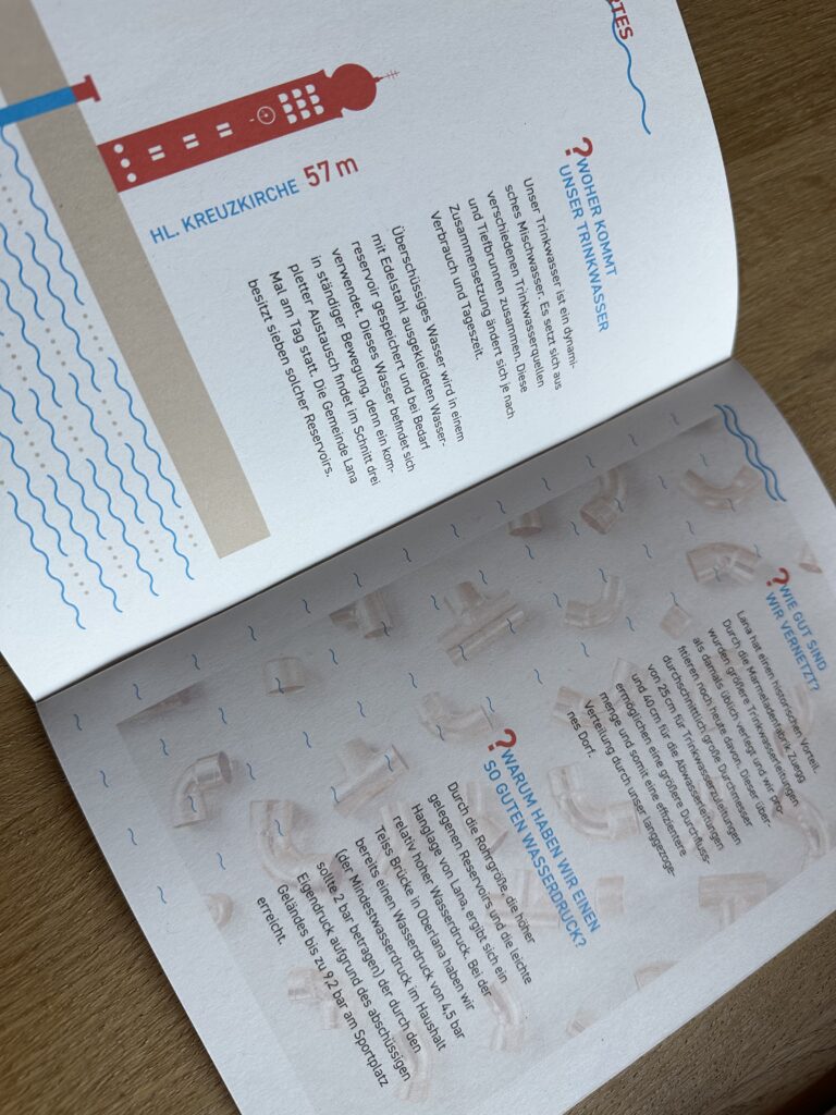 Die Informationsbroschüre wurde von Christoph Rainer, welcher seit 20 Jahren Hydrauliker der Gemeinde Lana ist, Andrea Eder und Verena Prünster entwickelt. Sie soll beispielsweise darüber informieren, wie viel Brunnen es in Lana gibt, woher das Wasser kommt oder wie man am besten Wasser sparen kann. Die Broschüre ist für Erwachsene und Kinder geeignet. „Es ist uns wichtig, unsere Bürger zu sensibilisieren, um einen bewussten Umgang mit Wasser zu fördern“, so Harald Stauder abschließend. Â