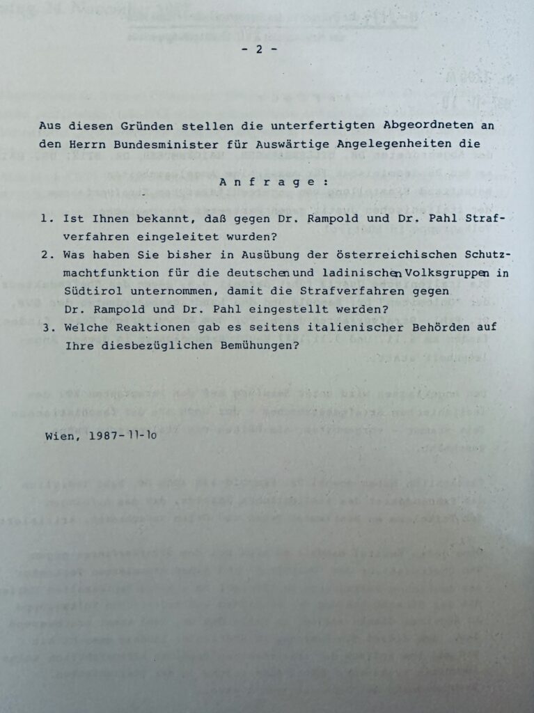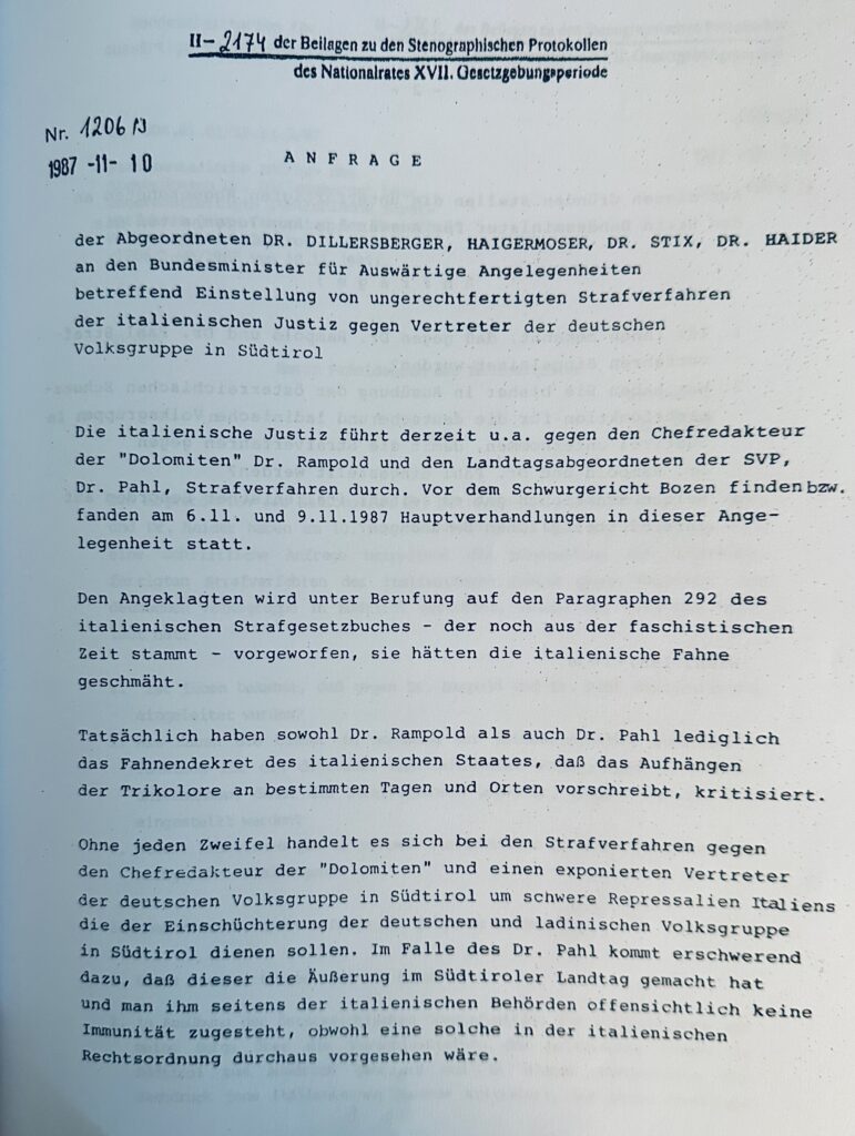 Die italienische Justiz führt derzeit u.a. gegen den Chefredakteur der „Dolomiten“ Dr. Rampold und den Landtagsabgeordneten der SVP, Dr. Pahl, Strafverfahren durch. Vor dem Schwurgericht Bozen finden bzw. fanden am 6.11. und 9.11.1987 Hauptverhandlungen in dieser Angelegenheit statt.