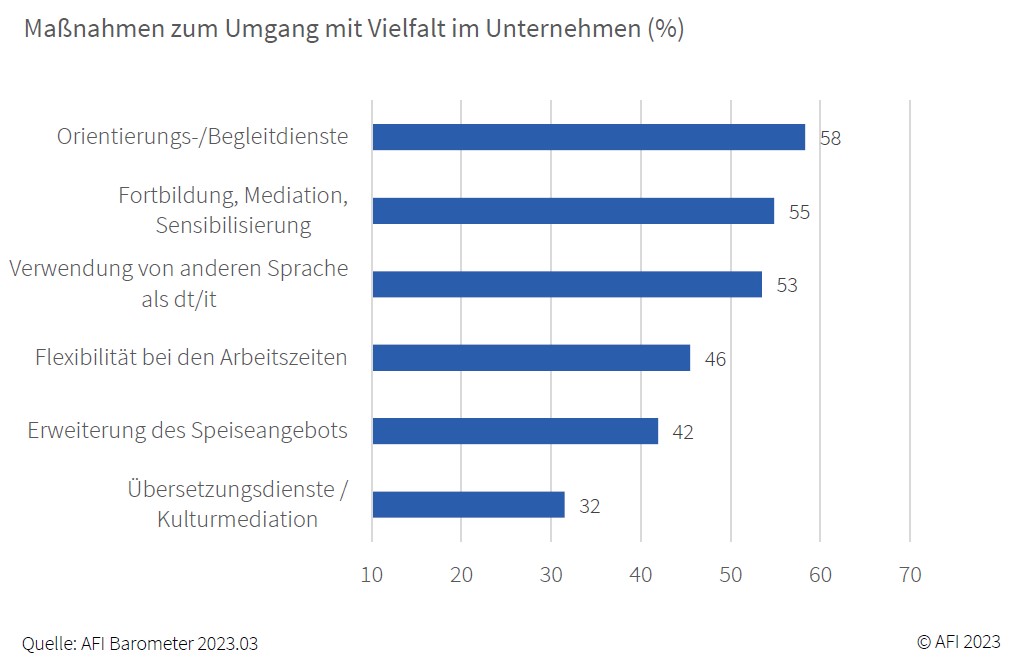 Was die Maßnahmen für einen besseren Umgang mit der Vielfalt im Betrieb betrifft, haben 42 Prozent der Befragten von Initiativen in der Betriebsmensa berichtet. 55 Prozent haben hingegen angegeben, dass der Arbeitgeber mit Fortbildung, Mediation und Sensibilisierung negative Auswirkungen der Vielfalt im Betrieb einzudämmen versucht. Über 58 Prozent berichten, der Arbeitgeber biete den Beschäftigten Unterstützung an, um ihre Inklusion zu fördern (z.B. bei der Wohnungssuche); 53 Prozent bestätigen, dass neben Deutsch und Italienisch noch andere Sprachen gesprochen werden.
